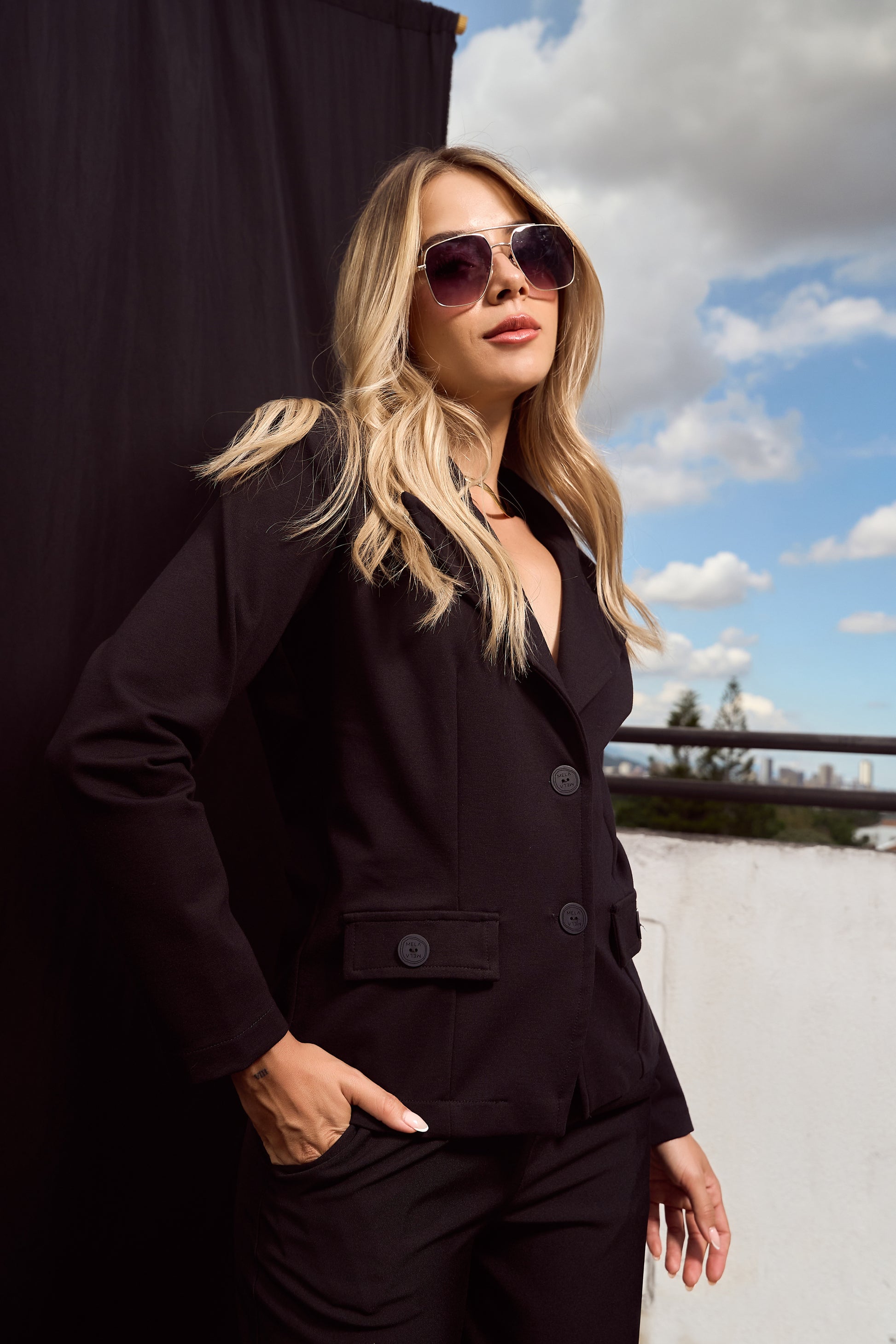 Blazer elegante, disponible en tonos blanco, beige y negro, destaca por su silueta estructurada y sofisticada. Incluye hombreras que realzan la forma y aportan presencia, mientras su corte clásico lo convierte en una prenda versátil para elevar cualquier look.