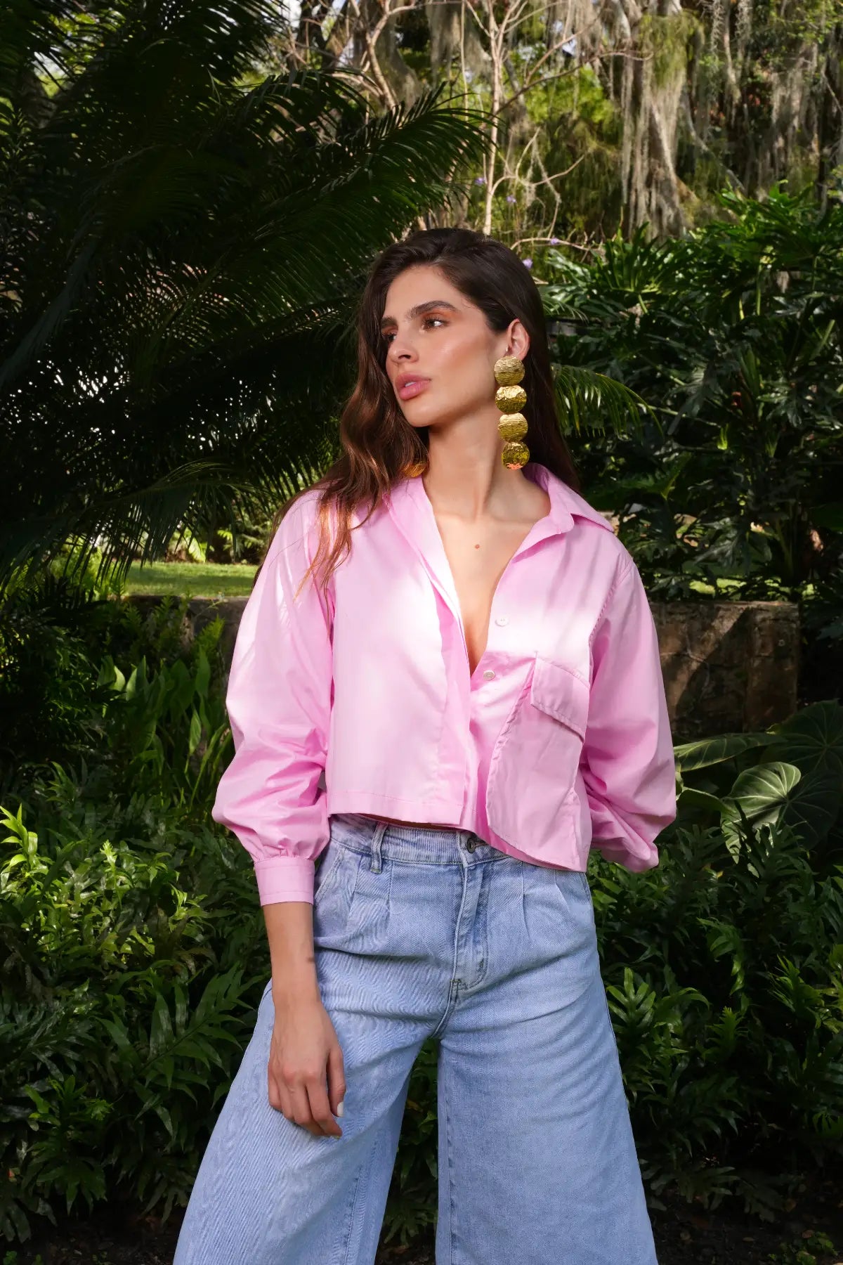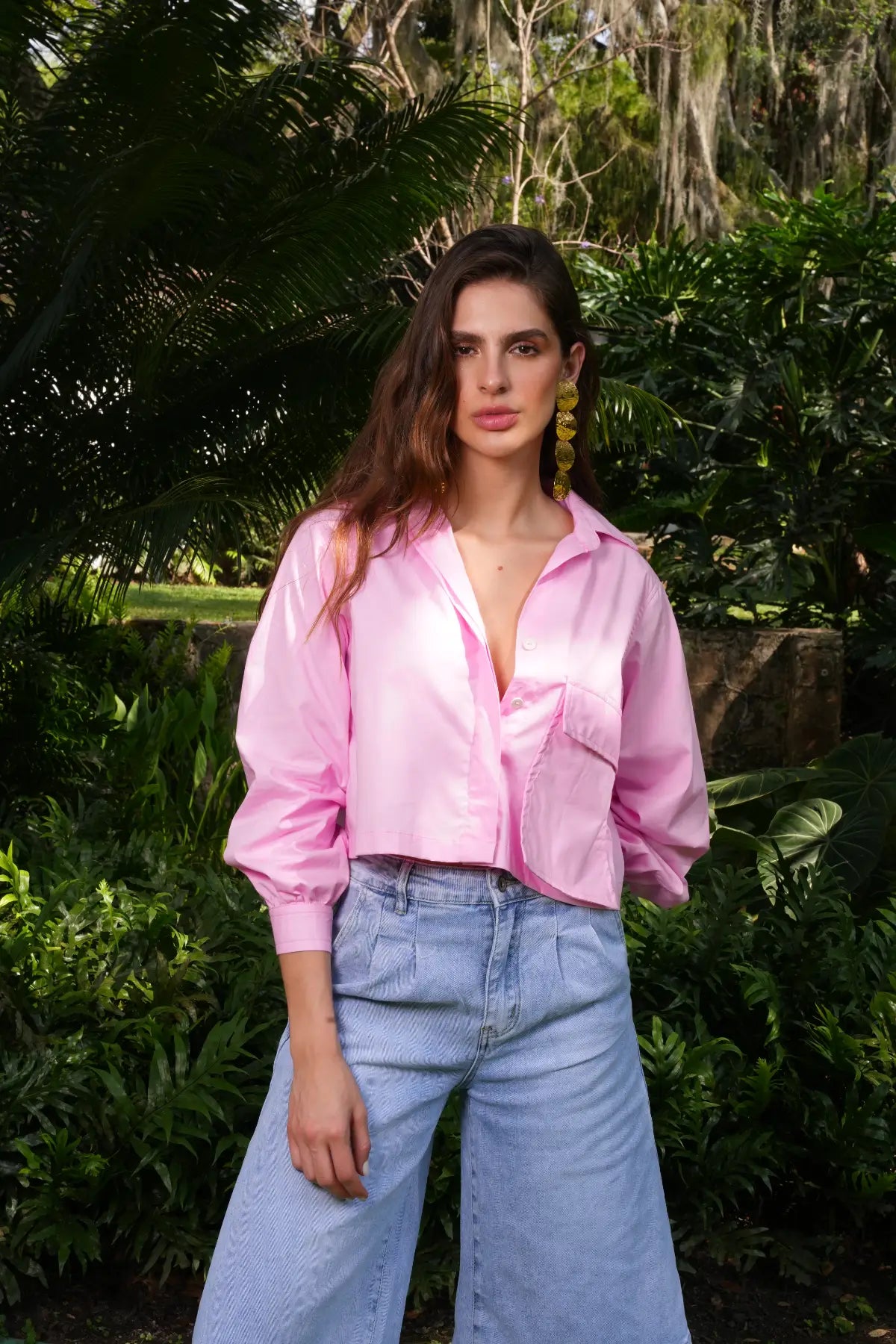 Camisa cropped rosa de manga larga con bolsillo frontal, botones y cuello clásico.