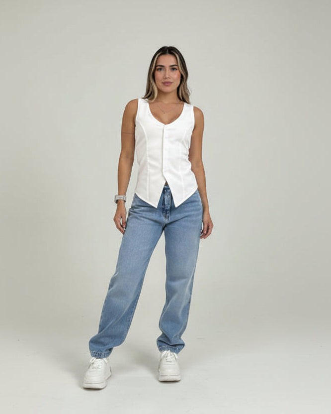 Chaleco sin mangas de corte entallado tipo sastre, con escote en V profundo y costuras marcadas que realzan y definen la silueta con un estilo elegante y muy moderno.