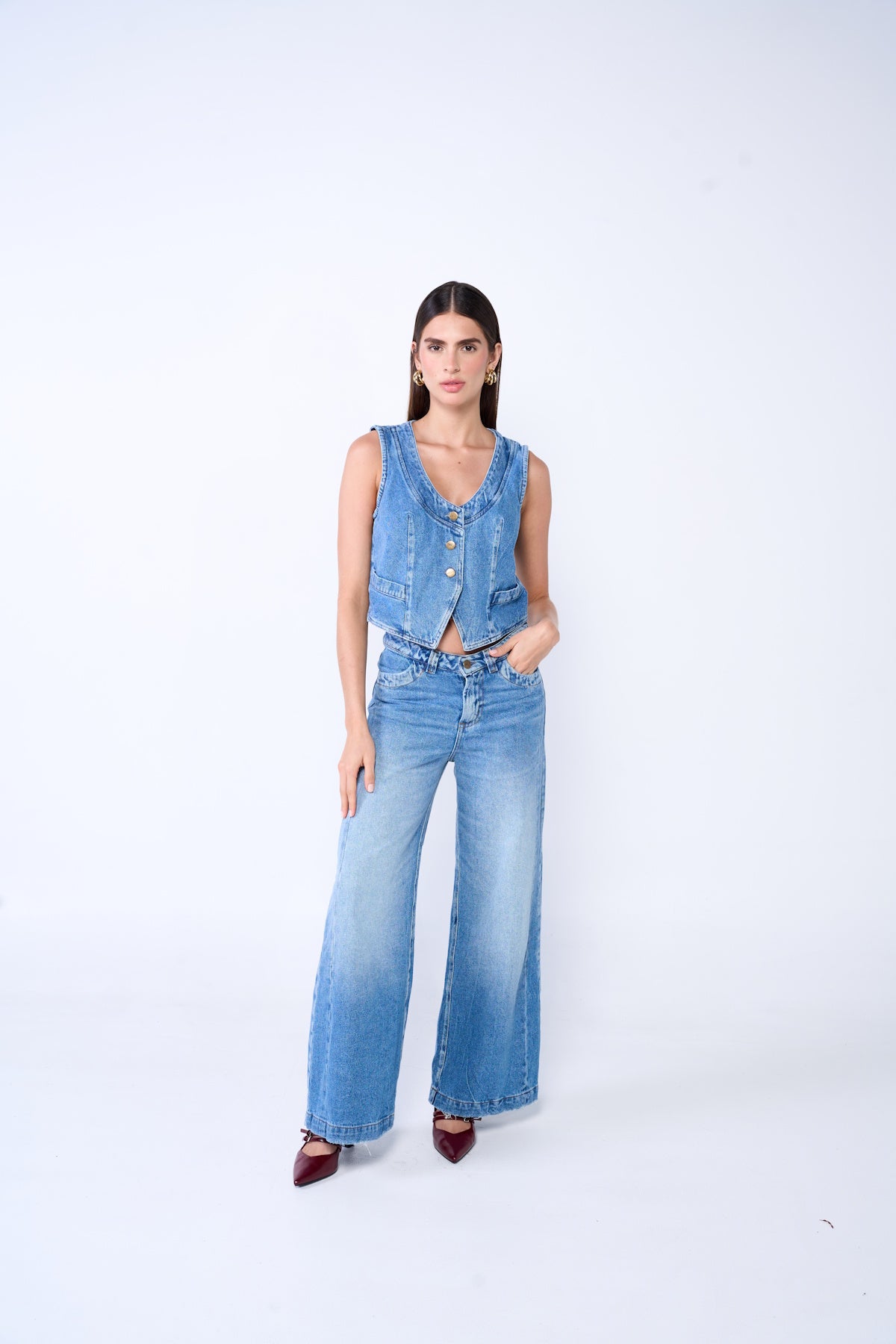 Chaleco de denim rígido, sin mangas y ligeramente corto. Su escote en V y tres botones frontales realzan el diseño, aportando un estilo moderno y versátil, ideal para elevar looks casuales con un toque chic.