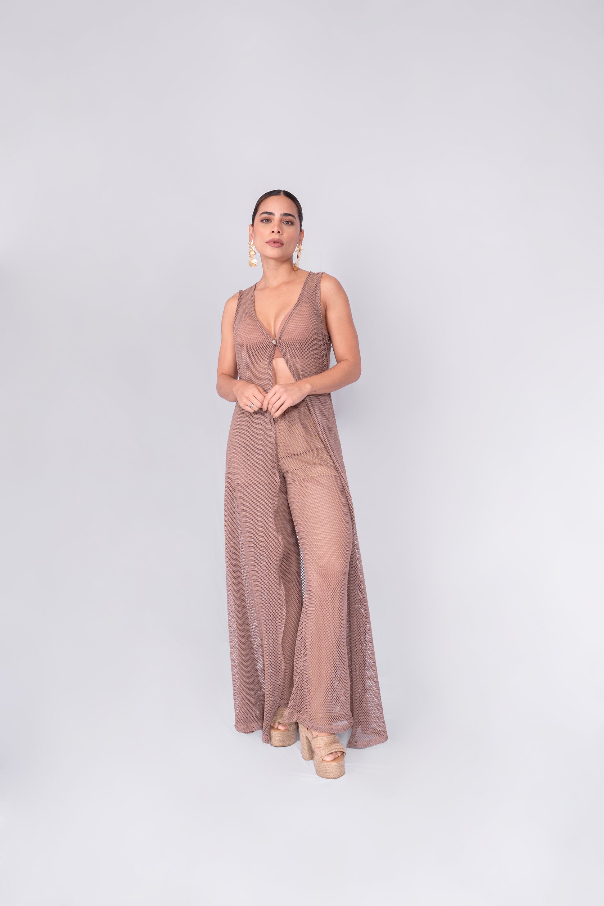 Chaleco largo estilo cover up, confeccionado en malla translúcida con caída ligera. Cuenta con escote profundo en V, sin mangas y un delicado broche frontal que permite llevarlo abierto o semi cerrado.