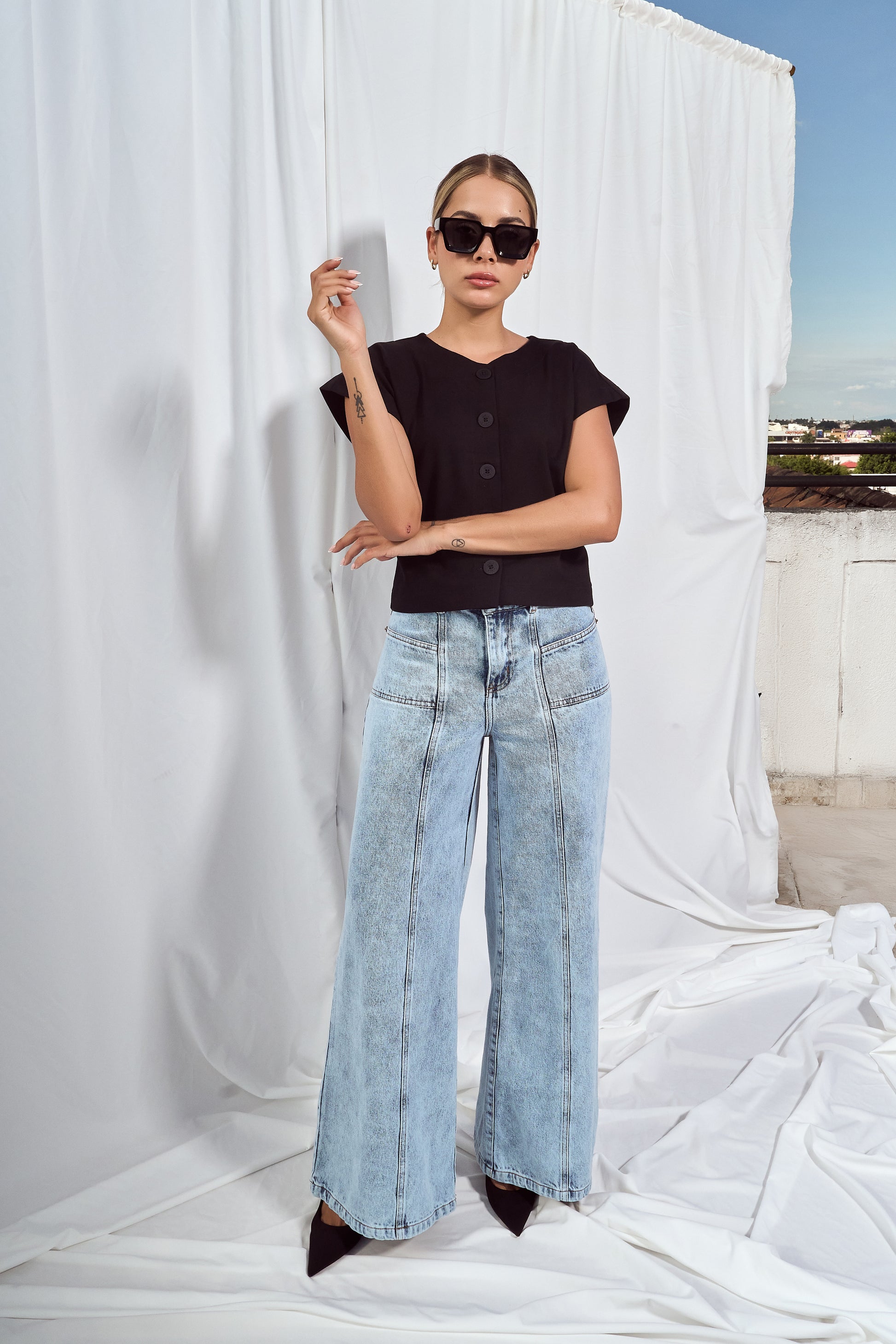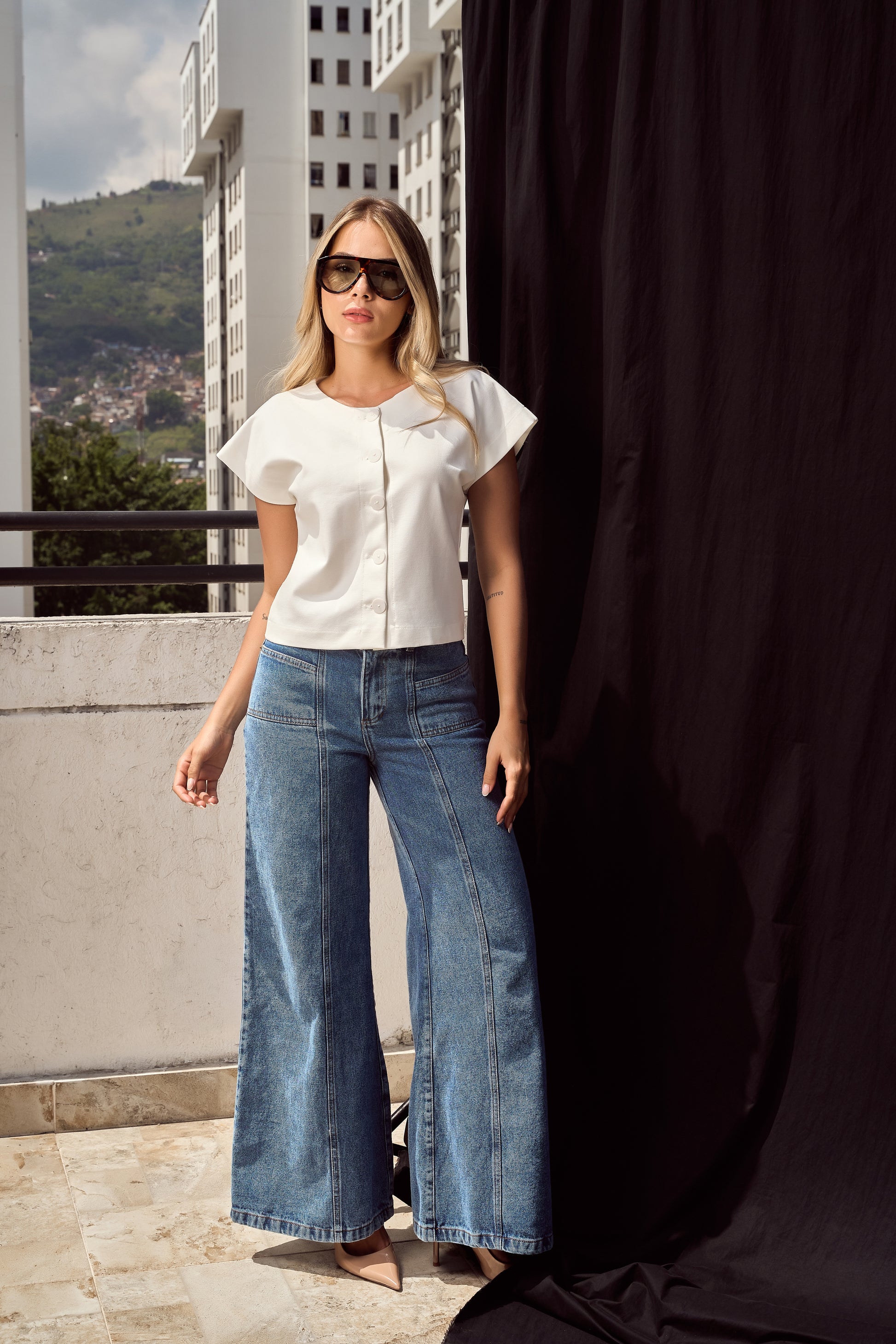 Blusa que combina elegancia y sobriedad en cada detalle. Presenta botones frontales que aportan un toque clásico y mangas estructuradas que realzan la silueta con sutileza.