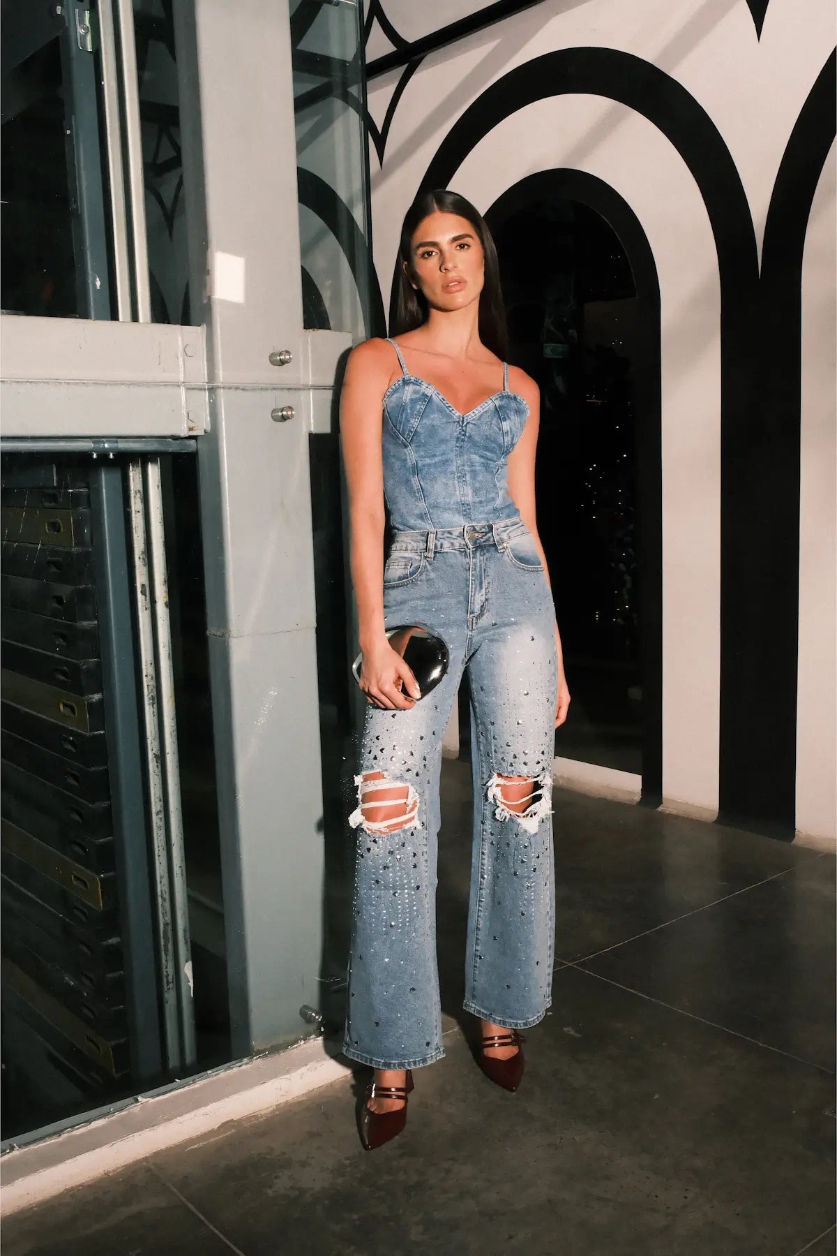 Blusa tipo corset en denim de lavado azul claro. Tiene tirantes delgados ajustables, escote corazón que realza el busto y costuras marcadas verticales que le dan una estructura tipo bustier, estilizando la silueta. El diseño es entallado, corto a la cintura, con un acabado moderno y femenino.