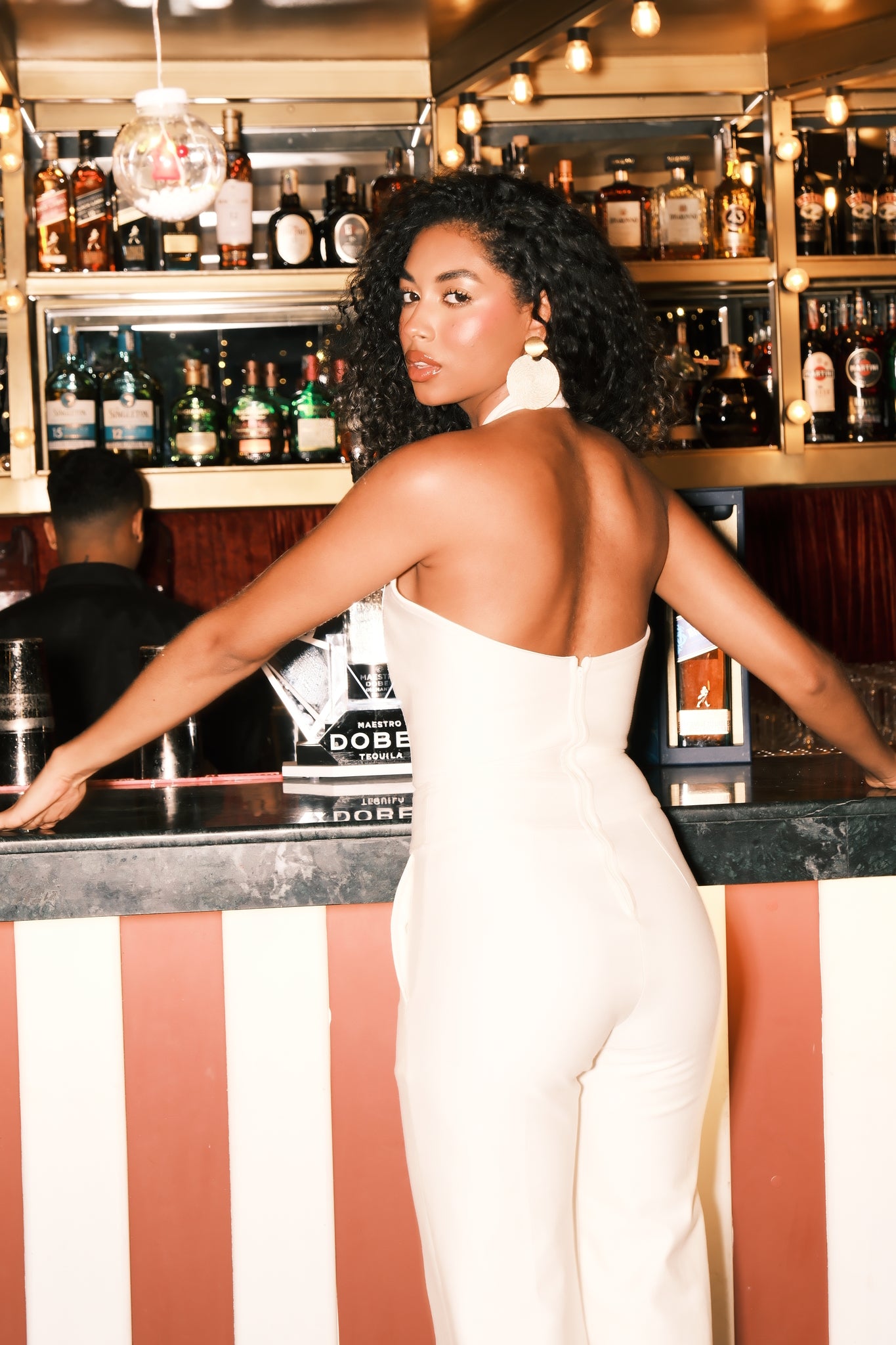 Enterizo elegante de silueta estilizada, confeccionado en tono blanco. Presenta un escote halter profundo en V que realza el cuello y el busto, aportando un toque sofisticado y femenino. Su diseño de pierna recta y amplia brinda una caída fluida que alarga visualmente la figura, ofreciendo comodidad y estilo. Ideal para eventos especiales, cenas elegantes o celebraciones donde quieras destacar con un look moderno y refinado.