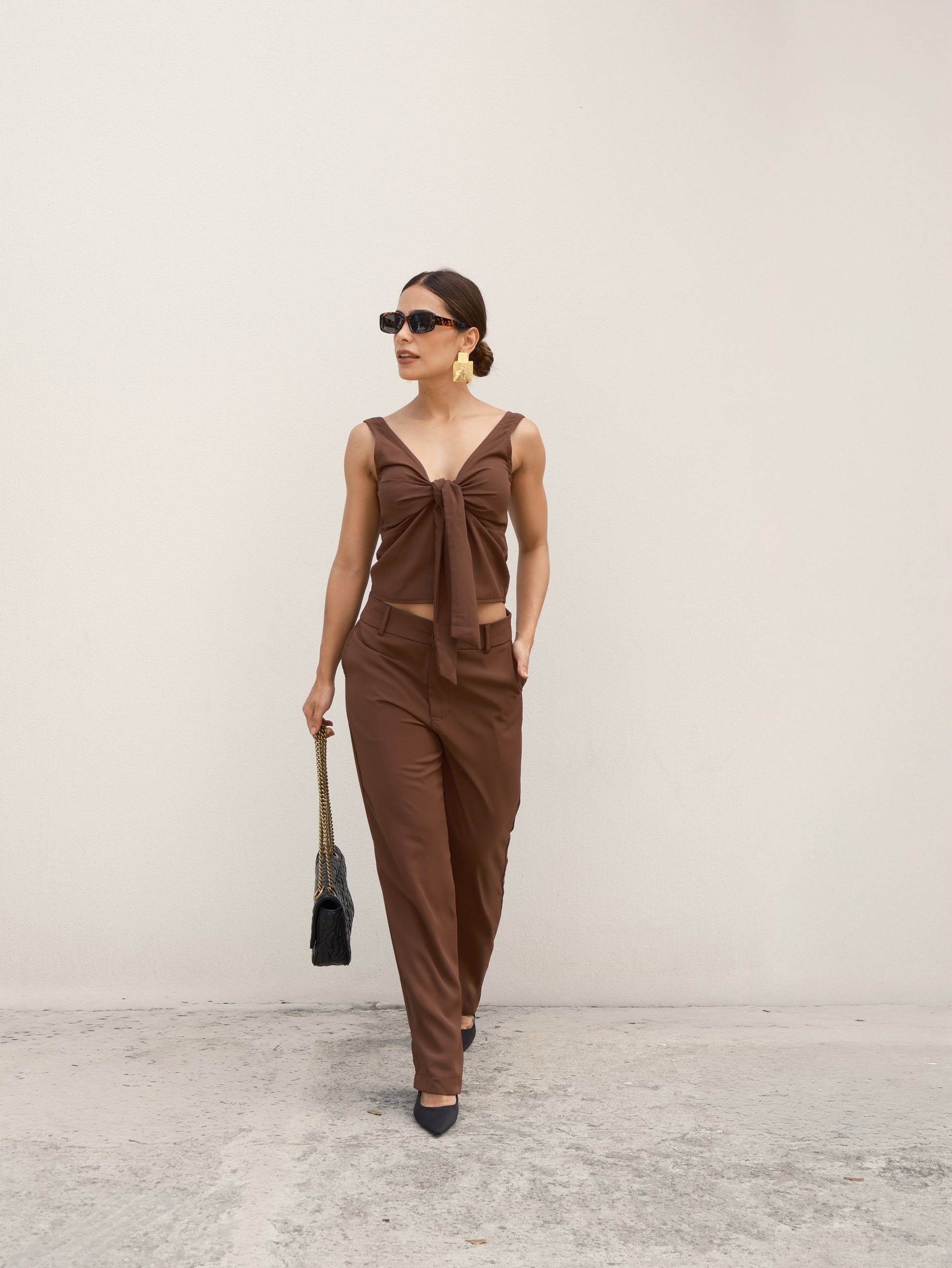 Pantalón de tiro medio, confeccionado en una tela suave de caída ligera. Cuenta con pretina ancha y doble botón frontal decorativo, acompañado de cierre oculto. Incluye bolsillos laterales funcionales para mayor comodidad. Su diseño limpio y elegante lo hace ideal para looks casuales o de oficina.