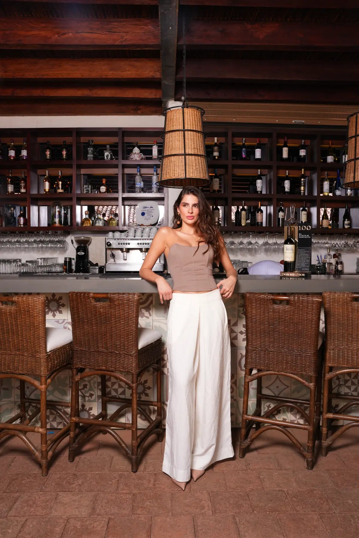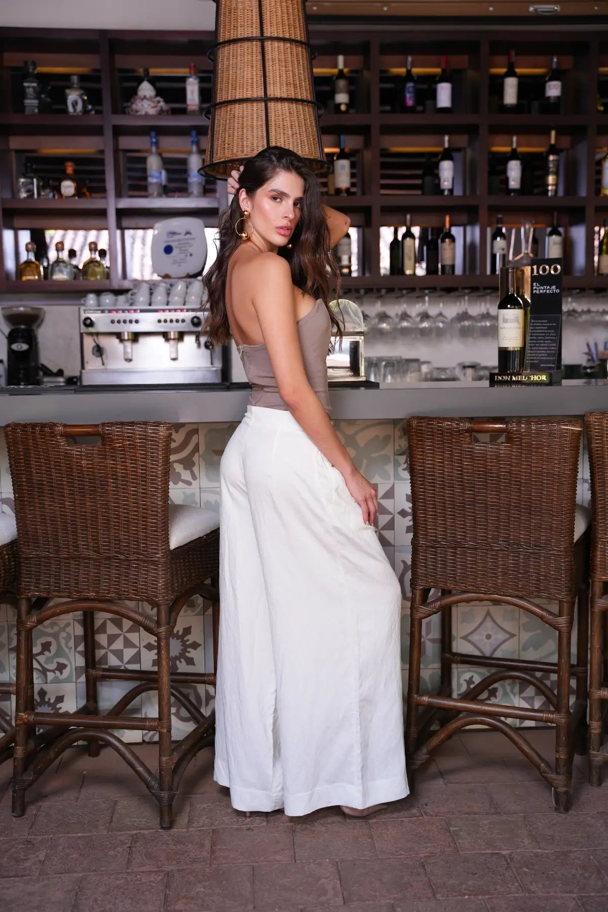 Pantalón palazzo de tiro alto con caída fluida y pliegues frontales.