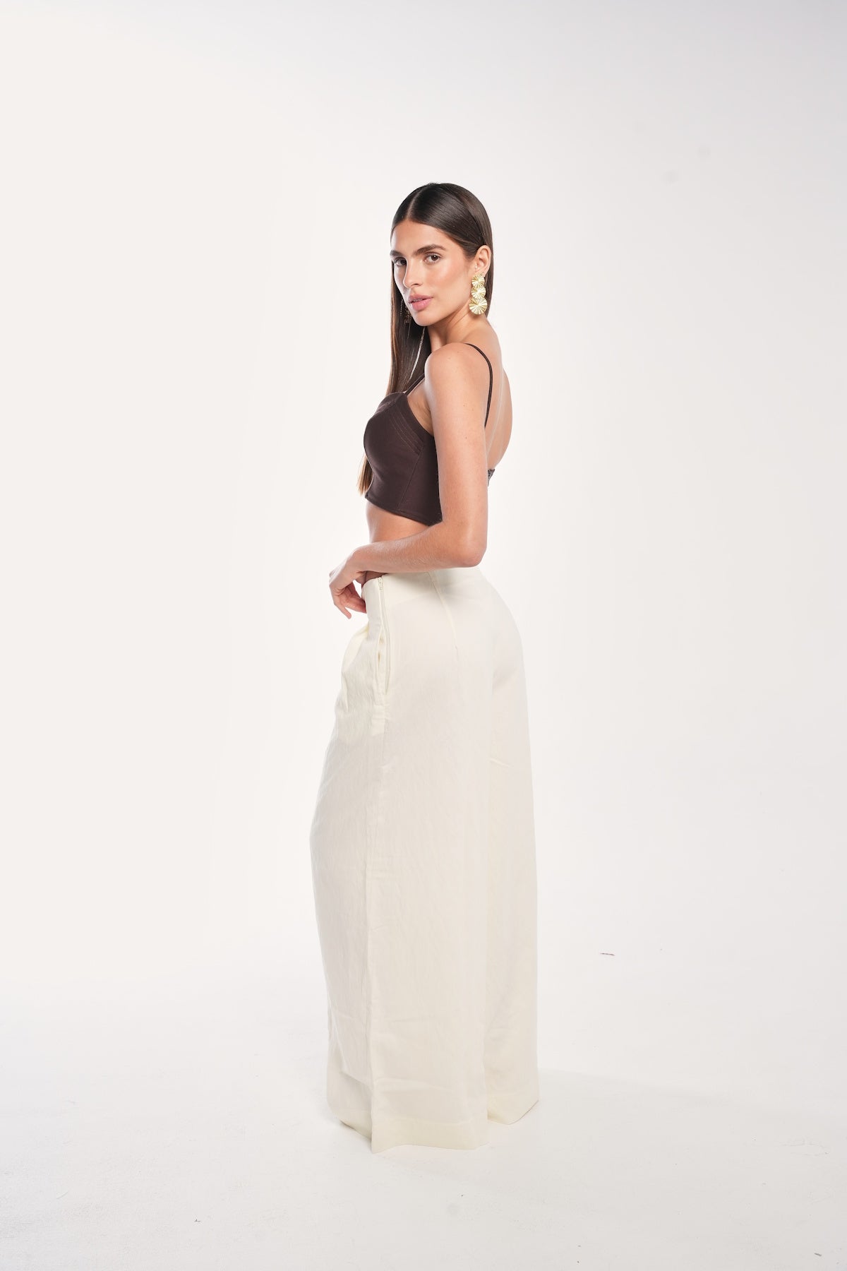 Pantalón palazzo de tiro bajo con caída fluida y pliegues frontales.