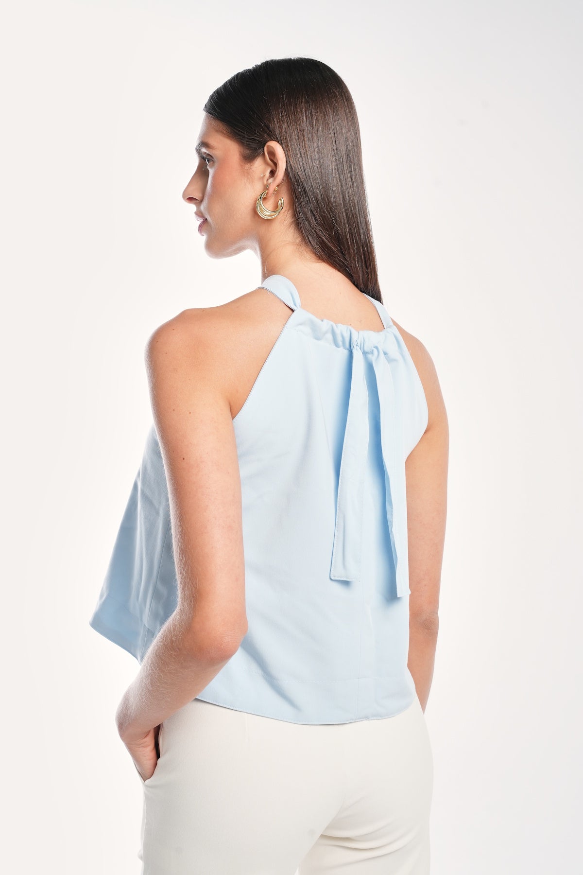 Resalta por su escote halter adornado con un broche metálico que une las tiras y crea una elegante abertura frontal. Su caída suave y silueta relajada le dan un aire moderno y sofisticado, perfecto para ocasiones especiales o para elevar un look casual con un toque refinado.
