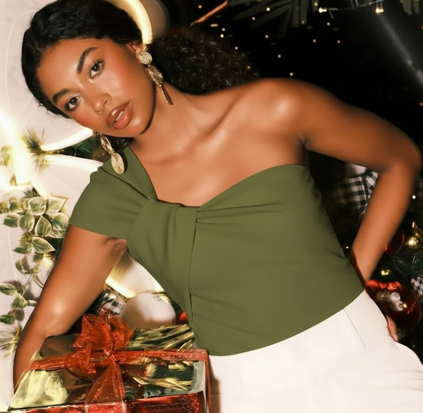 Top largo con diseño asimétrico de un solo hombro, que aporta un estilo moderno y sofisticado. Presenta detalle de drapeado y pliegues suaves en la parte superior, realzando la silueta y añadiendo textura al diseño.