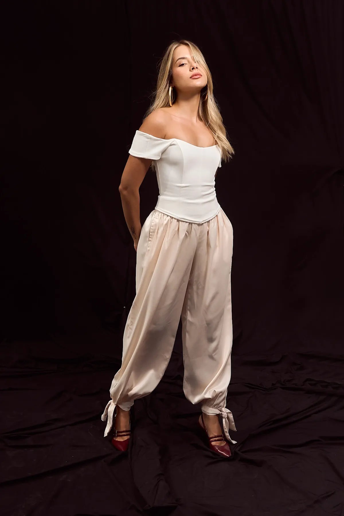 "top largo con mangas, silueta ajustada, descubierto en hombros, en tela ponti roma"