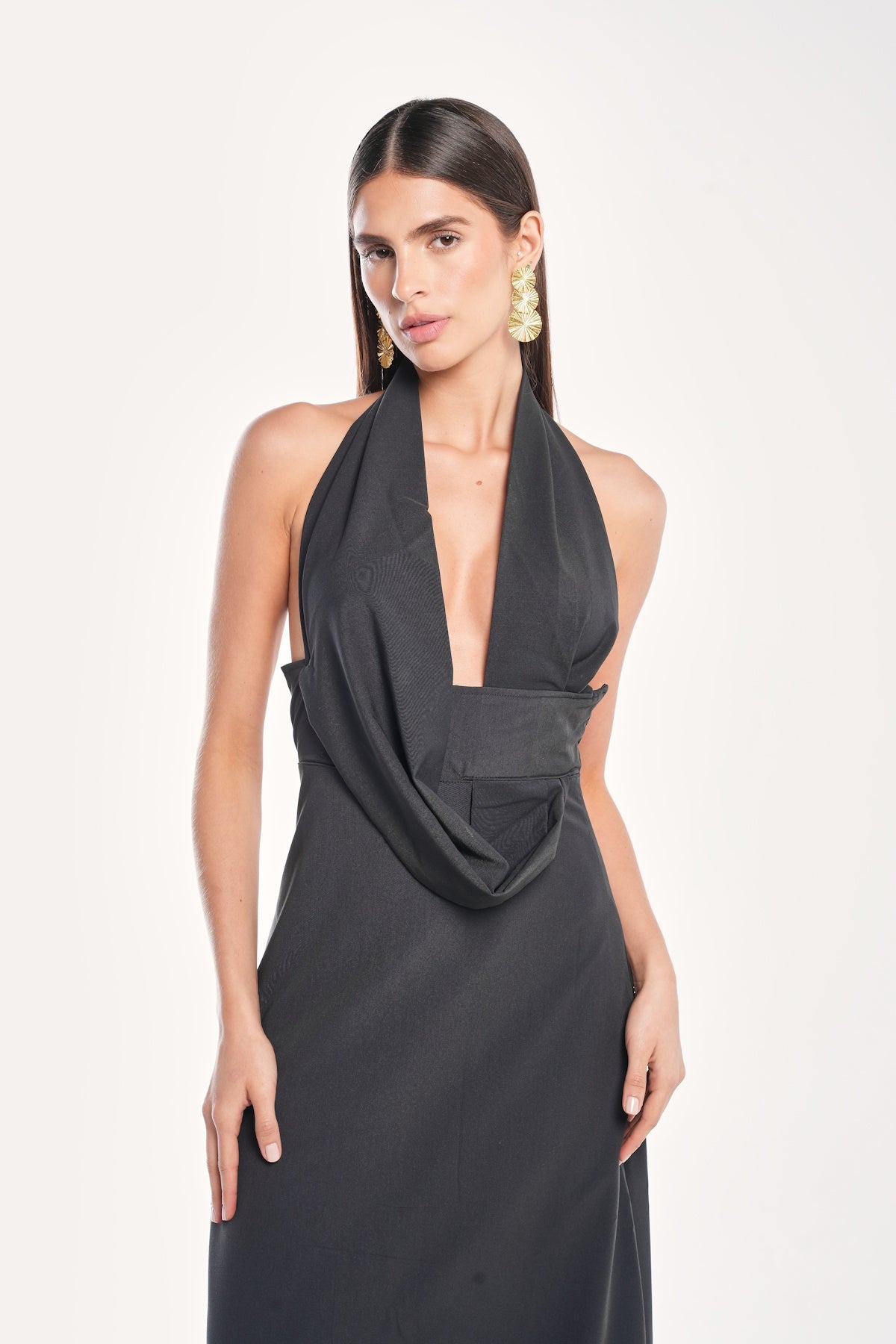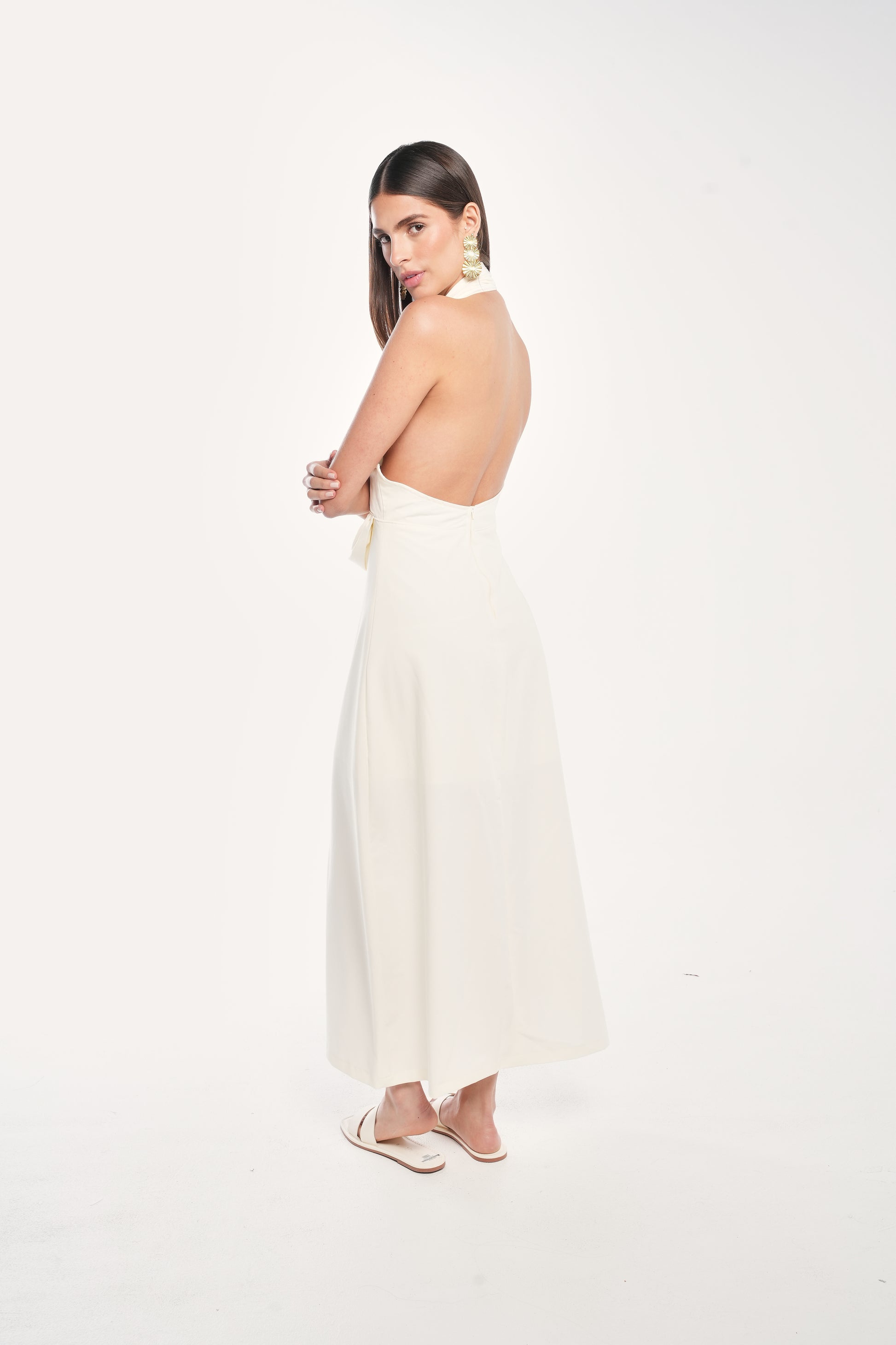 Vestido largo de silueta fluida y femenina, confeccionado en tela ligera de caída suave que aporta movimiento y frescura. Presenta un detalle ancho en el pecho tipo pechera, que aporta estructura y se convierte en el punto focal del diseño, logrando un equilibrio entre elegancia y modernidad.
